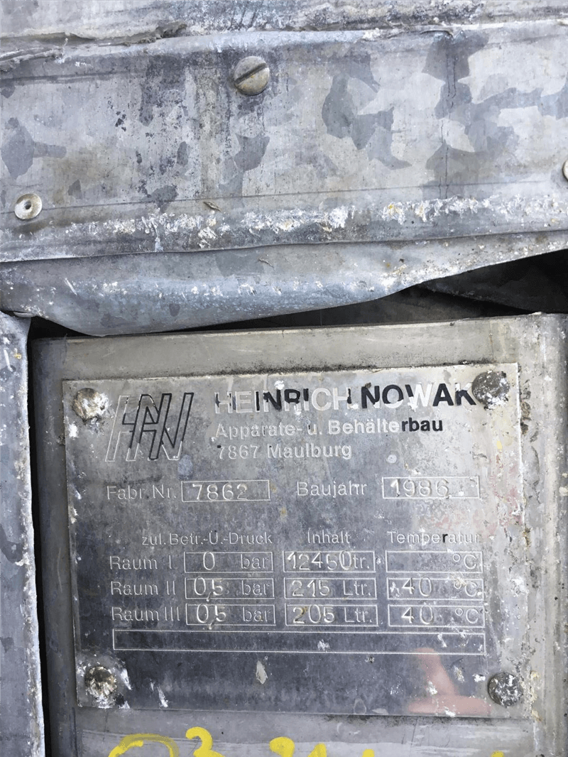 Omschrijving (NL) | Plaatdikte dubbele mantel om de cilinder: 3.2 mm • Plaatdikte dubbele mantel om de bodem: 4 mm • isolatie is beschadigd van de 4 tanks • isolatie sterk vervuild bovenaan door olie reductor roerwerk |