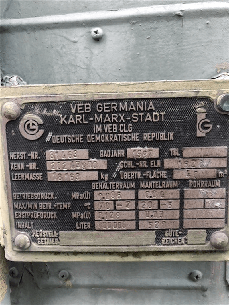 Omschrijving (NL) | Tank staat op stalen voetring 1 flensaansluiting NW 500 met neergelaten CIP-lijn DN 80 1 ontluchtingspijp DN 200 op de cilinder: Flensaansluiting NW 50 voor verwarmingssysteem in en uit. Op de Bodem: 1 mangat 450 x 350 mm Uitlaat DN 100 |