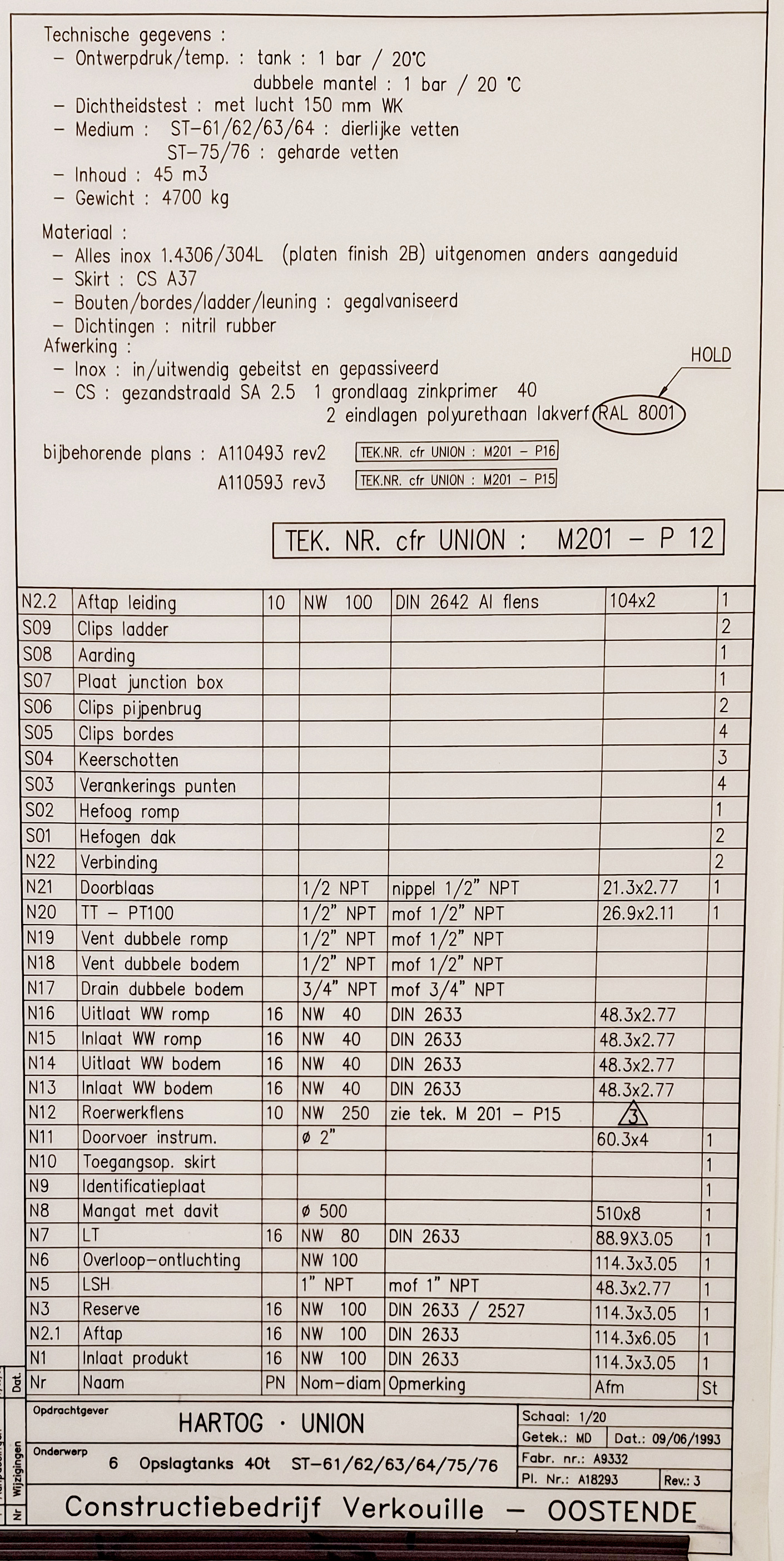 | Omschrijving (NL) | Tracing op uitlaat van de tank --- stoom in / stoom uit --- 3x jackets op mantel + bodem --- ontwerpdruk tank 1 bar (20°C) --- ontwerpdruk dubbele mantel 1 bar (20°C) |