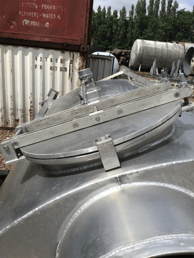 Omschrijving (NL) | Gebruikte silo - Aluminium - 10500L - Kop (1x flens Ø600 mm, 1x flens Ø390 mm, 1x buis Ø80 mm binnen, 1x buis Ø60 mm binnen, 1x gat Ø475 mm binnen) - Cilinder (1x mangat Ø570 mm binnen) - Bodem (trilmotor, draaisluis) |